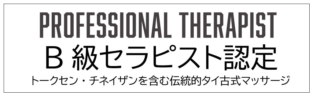 B級資格は、伝統的なタイ古式マッサージのプロ資格です。この資格の認定を受けることで、あなたの提供するマッサージスキルが安全かつプロレベルであることが証明されます。由緒正しいタイ古式マッサージは、エネルギーラインを的確にとらえ、自然治癒力を向上させます。トークセンやパーカオマーも加えながら、本格的な伝統施術を提供することの証明です。リフレクソロジーやチネイザンなどの部位ごとの施術スキルも保証されますから、プロセラピストとして本格的にフリーランス活動を行う際に有効な資格です。業界団体に本格的な古式マッサージを提供できるプロとして正式登録されることで、各種サポートも受けられるようになります。事故補償サポートでは、1事故あたり1億円までの事故補償サポートが受けられるようになります。自宅サロン、提携先店舗、出張先ホテルなどの場所を選びません。副業でも、フルタイムでも、日中でも深夜でも365日24時間対応しています。B級資格者が、店舗を構える場合には「TTMA公認サロン」として認定され、優良店舗として紹介されます。